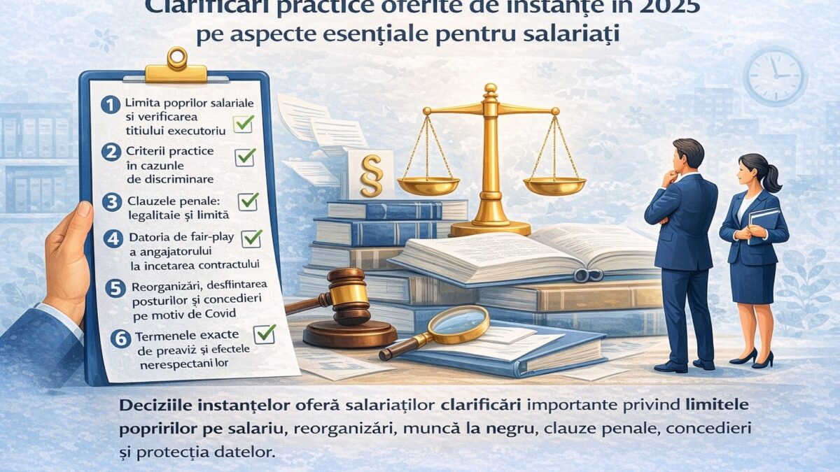 În 2025, practica instanțelor a adus o serie de clarificări relevante pentru aplicarea corectă a legislației muncii. Deși regulile de bază sunt deja prevăzute în Codul muncii și în legislația conexă, interpretarea concretă a unor situații frecvente (conflicte disciplinare, încetări, drepturi salariale, discriminare, clauze contractuale) rămâne un punct sensibil atât pentru angajați, cât și pentru angajatori.