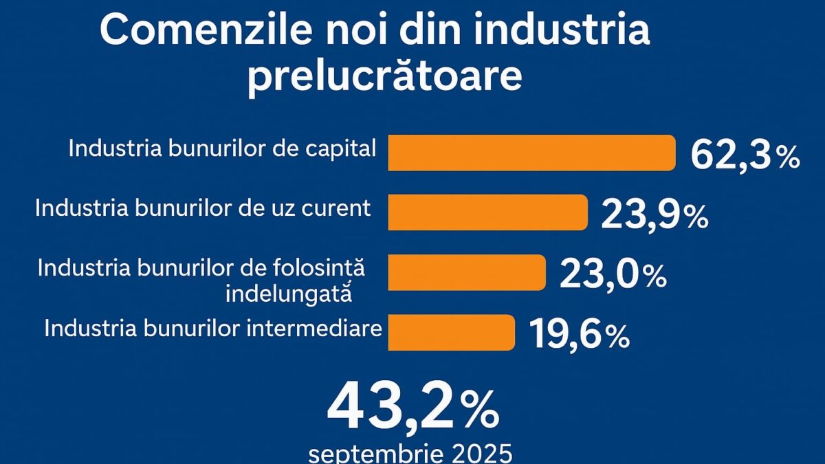 Comenzile noi în industria prelucrătoare în septembrie 2025 au înregistrat o creștere semnificativă, marcând una dintre cele mai dinamice evoluții lunare din acest an. Față de luna august 2025, volumul total al comenzilor noi a avansat cu 43,2%, semnalând o revigorare solidă a cererii pentru producția industrială și o intensificare a activității în sectoarele orientate către investiții și consum.