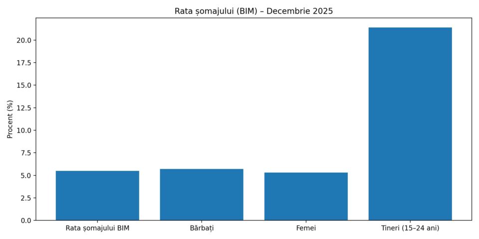 Rata șomajului înregistrată conform metodologiei Biroului Internațional al Muncii (BIM) s-a situat la 5,5% în luna decembrie 2025, menținându-se la un nivel relativ constant față de […]