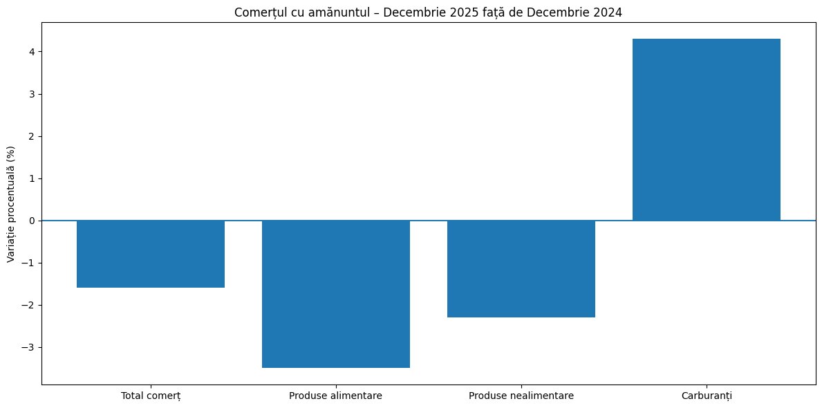 Volumul cifrei de afaceri din comerțul cu amănuntul (fără autovehicule și motociclete) a înregistrat o scădere în luna decembrie 2025 față de aceeași lună din 2024, […]