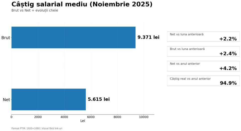 Câștigul salarial mediu net din România a ajuns la 5.615 lei în noiembrie 2025, în creștere față de luna precedentă. La nivel brut, salariul mediu a […]