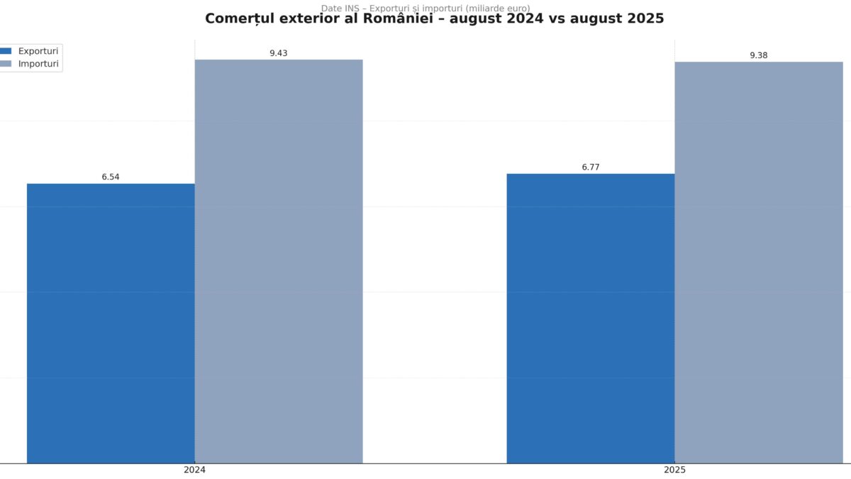 Datele recente arată că, în luna august 2025, exporturile României au însumat 6,77 miliarde euro, iar importurile 9,38 miliarde euro, ceea ce a generat un deficit comercial de 2,61 miliarde euro.