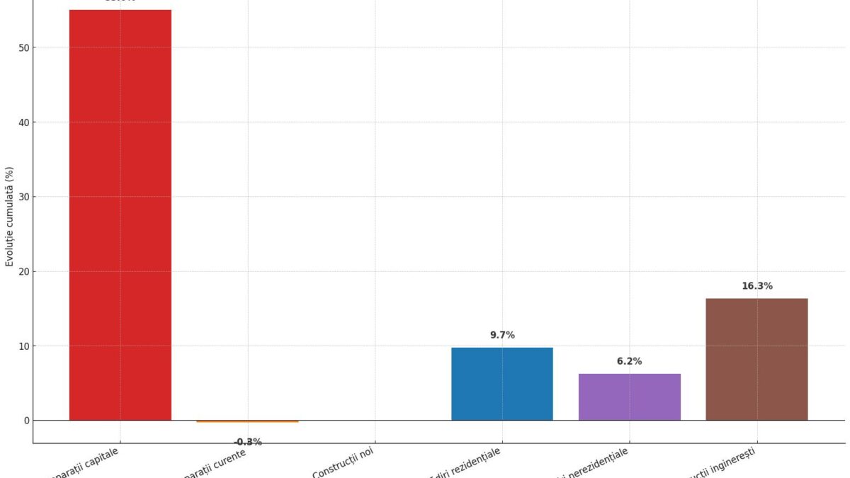 • Întreținerea și reparațiile curente au crescut cu +41,1%, iar construcțiile noi cu +35,7%.