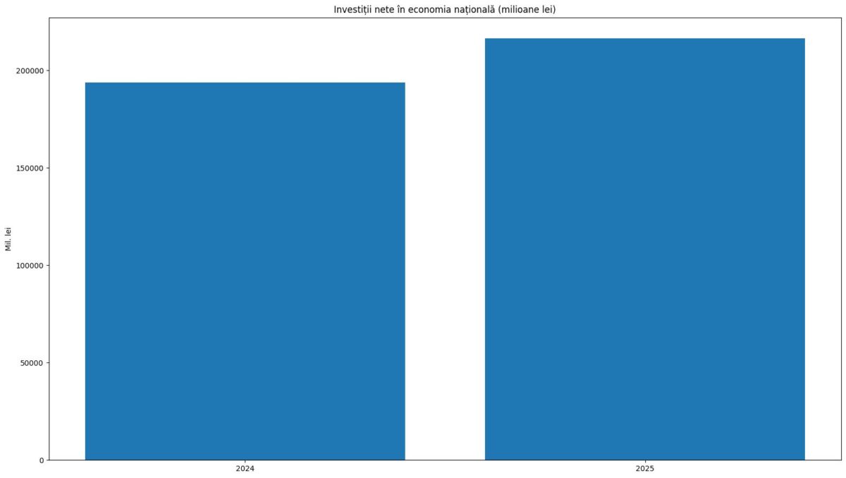 Datele privind investițiile arată o evoluție favorabilă în 2025, în contrast cu alte sectoare care încep anul 2026 în scădere. Investițiile nete realizate în economia națională au ajuns la peste 216 miliarde lei, marcând o creștere de 5% față de anul anterior