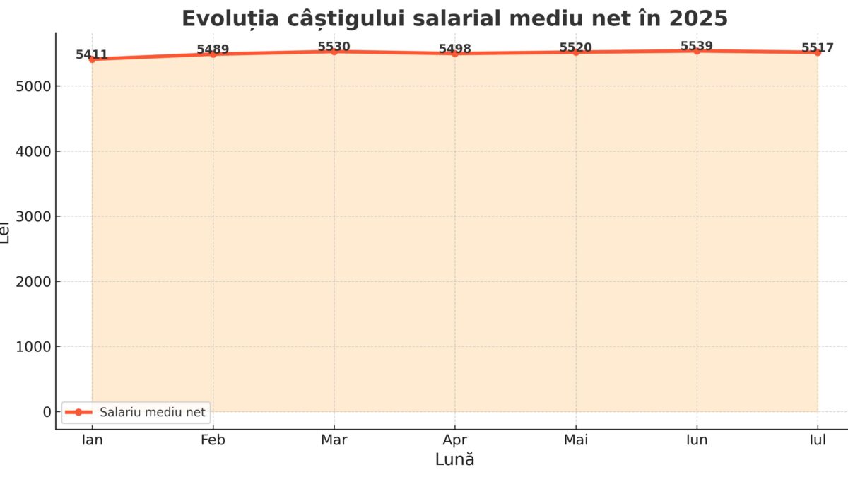 Potrivit datelor publicate de INS, câștigul salarial mediu net a fost de 5.517 lei în iulie 2025, în scădere cu 22 de lei față de luna iunie (-0,4%). Cele mai mari scăderi s-au înregistrat în domenii precum editarea (-10,8%), intermedierile financiare, telecomunicațiile sau industria calculatoarelor, unde diminuările au variat între 6% și 10%.