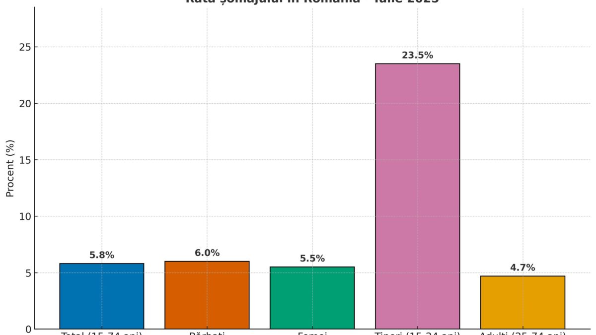 Pe sexe, șomajul la bărbați a fost de 6%, mai ridicat decât la femei (5,5%). Cel mai vulnerabil grup rămâne însă cel al tinerilor între 15 și 24 de ani, unde rata șomajului se menține la 23,5%, de patru ori mai mare decât media națională.