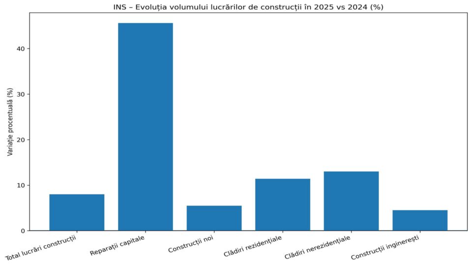 Volumul lucrărilor de construcții a crescut cu 8,0% în 2025, susținut de investițiile în reparații capitale și clădiri nerezidențiale