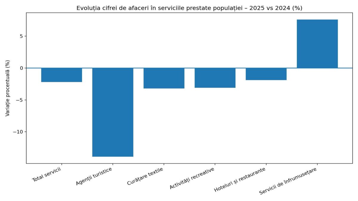 Cifra de afaceri din serviciile prestate populației a scăzut cu 2,2% în 2025, în ciuda unei reveniri la final de an