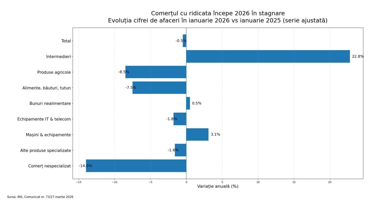 Cifra de afaceri din comerțul cu ridicata (cu excepția comerțului cu autovehicule și motociclete) a înregistrat o scădere în luna ianuarie 2026, atât față de luna […]