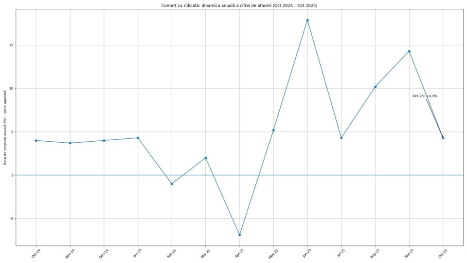 În luna octombrie 2025, cifra de afaceri din comerțul cu ridicata (cu excepția comerțului cu autovehicule și motociclete) a înregistrat o scădere față de luna precedentă, […]